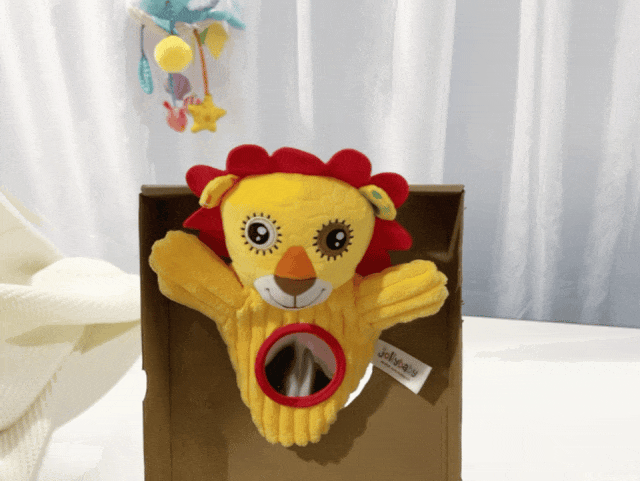2、妈妈带上手偶,从圆洞钻出,开始表演,引导宝宝挥手欢迎;