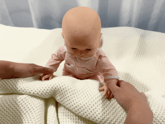 3、家长抓住浴巾前端,缓慢持续向前拉动浴巾;