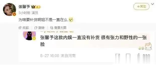 有网友在社媒留言称:“张馨予这款内娱一直没有补货,是很有野性和张力的一张脸。”这一表达很快引发讨论。她随即在个人账号做出回应,语气轻松地写道:“为啥要补货呀?姐不是一直在么。”这句话既展现出她的自信,也让人感受到她对演艺事业的热爱与坚持。
