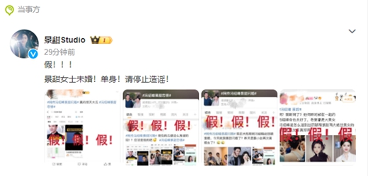 然而,真相往往与谣言背道而驰。9月4日,景甜工作室通过微博账号“景甜Studio”果断发布声明,明确否认婚讯:“假!!!景甜女士未婚!单身!请停止造谣!”这则声明如同一声惊雷,打破了网友们的美好幻想。新浪娱乐等媒体账号迅速转发该声明,使其成为权威信源,让谣言不攻自破。虽然冯绍峰方暂未公开回应,但景甜方的辟谣已经直接否定了这一传闻。