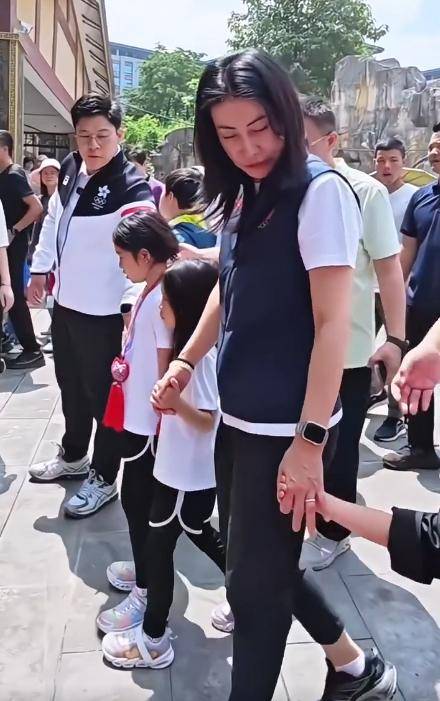 俩孩子看手机的时候,郭晶晶也没催,就站在旁边陪着,眼神里全是普通妈妈的温柔,一点没因为是公众人物就敷衍孩子。