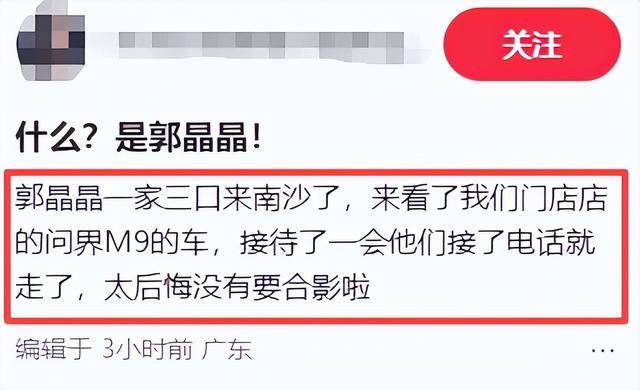 除了放照片,网友还特意提了一嘴看车的细节:郭晶晶一家重点看的是店里一款50万左右的国产电车,近几年这个牌子在国产车里口碑特别好,性能和空间都适合多人口家庭。